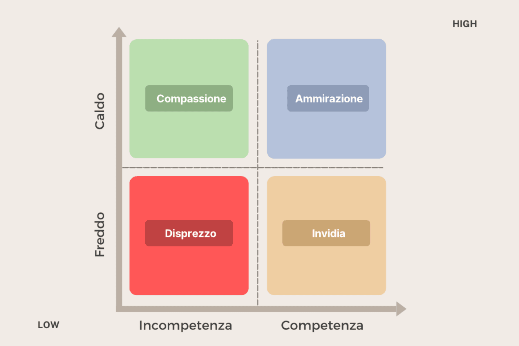 Compassione, in alto a sinistra, è caldo ma poco competente: le persone ti vogliono bene ma non si fidano del tuo giudizio professionale.